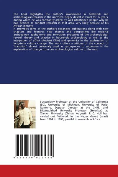 The book highligths the author's involvement in fieldwork and archaeological research in the northern Negev desert in Israel for 12 years, during which he was constantly asked by well-intentioned people why he had decided to conduct research in that area, very likely because of his African identity. It assembles some of the author's expanded publications along with new chapters and features new themes and perspectives like regional archaeology, taphonomy and formation processes of the archaeological record, theory and practice in household archaeology, as well as the integration of aDNA (Ancient DNA) and genomics in the explanation of long-term culture change. The work offers a critique of the concept of "transition" almost universally used as synonymous to succession in the explanation of change from one archaeological culture to the next.