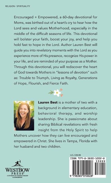 Encouraged + Empowered, a 60-day devotional for Moms, was birthed out of a heart's cry to hear how the Lord sees and values Motherhood, especially in the middle of the difficult seasons of life. This devotional will bolster your faith, boost your joy, and help you hold fast to hope in the Lord. Author Lauren Best will guide you into revelatory moments with the Lord as you experience more of His presence, recognize His power in your life, and are reminded of your purpose as a Mother. Through this devotional, you will rediscover the heart of God towards Mothers in "lessons of devotion" such as: Trouble to Triumph, Living as Royalty, Generations of Hope, Flourish, and Fierce Faith.