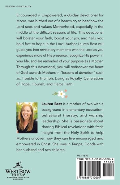Encouraged + Empowered, a 60-day devotional for Moms, was birthed out of a heart's cry to hear how the Lord sees and values Motherhood, especially in the middle of the difficult seasons of life. This devotional will bolster your faith, boost your joy, and help you hold fast to hope in the Lord. Author Lauren Best will guide you into revelatory moments with the Lord as you experience more of His presence, recognize His power in your life, and are reminded of your purpose as a Mother. Through this devotional, you will rediscover the heart of God towards Mothers in "lessons of devotion" such as: Trouble to Triumph, Living as Royalty, Generations of Hope, Flourish, and Fierce Faith.