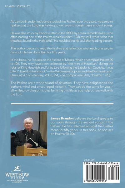 As James Brandon read and studied the Psalms over the years, he came to realize that the Lord was talking to our souls through these ancient songs. He was also struck by a book written in the 1800s by a man named Hawker, who after reading one of the Psalms would exclaim: "Oh my soul, what is this that thou hast found in the Holy Writ?" He would talk to his soul after reading the text. The author began to read the Psalms and reflect on what each one said to his soul. He has done that for fifty years. In this book, he focuses on the Psalms of Moses, which encompass Psalms 90 to 106. They may have been collected by "the men of Hezekiah" during the reign of King Hezekiah and/or by Ezra following the Babylonian Captivity. It was titled "The Numbers Book"-the Wilderness Sojourn and the Promised Land. (The Pulpit Commentary, Vol. 8, 254; The Companion Bible, "Psalms," 720). The Psalms are a wonderland of devotion. They have enlightened the author's mind and encouraged his spirit. They can do the same for you-all while providing principles for living this life as you help others walk with the Lord.
