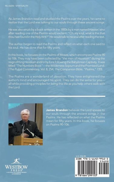 As James Brandon read and studied the Psalms over the years, he came to realize that the Lord was talking to our souls through these ancient songs. He was also struck by a book written in the 1800s by a man named Hawker, who after reading one of the Psalms would exclaim: "Oh my soul, what is this that thou hast found in the Holy Writ?" He would talk to his soul after reading the text. The author began to read the Psalms and reflect on what each one said to his soul. He has done that for fifty years. In this book, he focuses on the Psalms of Moses, which encompass Psalms 90 to 106. They may have been collected by "the men of Hezekiah" during the reign of King Hezekiah and/or by Ezra following the Babylonian Captivity. It was titled "The Numbers Book"-the Wilderness Sojourn and the Promised Land. (The Pulpit Commentary, Vol. 8, 254; The Companion Bible, "Psalms," 720). The Psalms are a wonderland of devotion. They have enlightened the author's mind and encouraged his spirit. They can do the same for you-all while providing principles for living this life as you help others walk with the Lord.