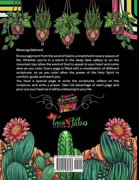 Encouragement from the Word of God is unmatched in every season of life. Whether you're in a storm in the deep dark valleys or on the mountain top; allow the word of God to speak to you heart and come alive as you color. Every page is filled with a visualization of different scriptures, so as you color allow the power of the Holy Spirit to comfort, guide, and teach you. You have a special page to write the scriptures, reflect on the scripture, and write a prayer. Take full advantage of each page and pour out your heart as it will be a blessing to your life. There are two bonus pages in the back of the coloring book titled "The Burdens and Cares of My Heart" and "Guide Me, Teach Me, Thank you Lord" for you to express yourself.