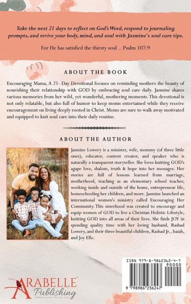 Encouraging Mama, A 21-Day Devotional, focuses on reminding mothers the beauty of nourishing their relationship with GOD by embracing soul care daily. Jasmine shares various memories from her wild, yet wonderful mothering moments. This devotional is not only relatable, but also full of humor to keep moms entertained while they receive encouragement on living deeply rooted in Christ. Moms are sure to walk away motivated and equipped to knit soul care into their daily routine.