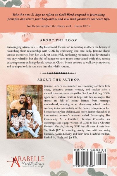 Encouraging Mama, A 21-Day Devotional, focuses on reminding mothers the beauty of nourishing their relationship with GOD by embracing soul care daily. Jasmine shares various memories from her wild, yet wonderful mothering moments. This devotional is not only relatable, but also full of humor to keep moms entertained while they receive encouragement on living deeply rooted in Christ. Moms are sure to walk away motivated and equipped to knit soul care into their daily routine.