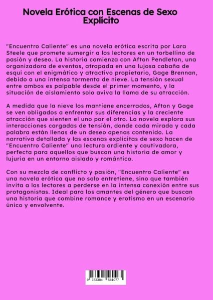 "Encuentro Caliente" es una novela erótica escrita por Lara Steele que promete sumergir a los lectores en un torbellino de pasión y deseo. La historia comienza con Afton Pendleton, una organizadora de eventos, atrapada en una lujosa cabaña de esquí con el enigmático y atractivo propietario, Gage Brennan, debido a una intensa tormenta de nieve. La tensión sexual entre ambos es palpable desde el primer momento, y la situación de aislamiento solo aviva la llama de su atracción.A medida que la nieve los mantiene encerrados, Afton y Gage se ven obligados a enfrentar sus diferencias y la creciente atracción que sienten el uno por el otro. La novela explora sus interacciones cargadas de tensión, donde cada mirada y cada palabra están llenas de un deseo apenas contenido. La narrativa detallada y las escenas explícitas de sexo hacen de "Encuentro Caliente" una lectura ardiente y cautivadora, perfecta para aquellos que buscan una historia de amor y lujuria en un entorno aislado y romántico.Con su mezcla de conflicto y pasión, "Encuentro Caliente" es una novela erótica que no solo entretiene, sino que también invita a los lectores a perderse en la intensa conexión entre sus protagonistas. Ideal para los amantes del género que buscan una historia que combine romance y erotismo en un escenario único y envolvente.
