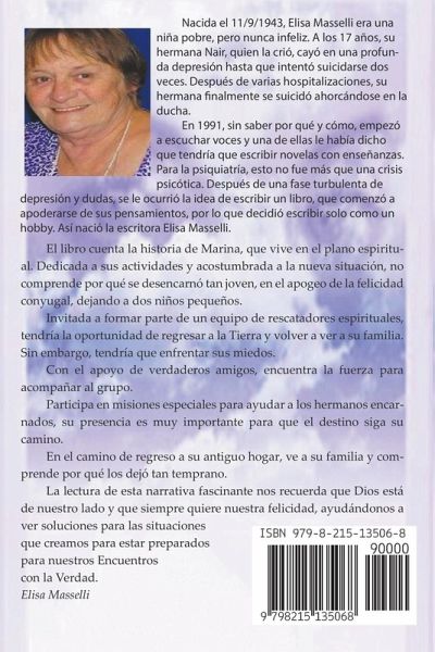 El libro cuenta la historia de Marina, que vive en el plano espiritual. Dedicada a sus actividades y acostumbrada a la nueva situación, no comprende por qué se desencarnó tan joven, en el apogeo de la felicidad conyugal, dejando a dos niños pequeños. Invitada a formar parte de un equipo de rescatadores espirituales, tendría la oportunidad de regresar a la Tierra y volver a ver a su familia. Sin embargo, tendría que enfrentar sus miedos. Con el apoyo de verdaderos amigos, encuentra la fuerza para acompañar al grupo. Participa en misiones especiales para ayudar a los hermanos encarnados, su presencia es muy importante para que el destino siga su camino. En el camino de regreso a su antiguo hogar, ve a su familia y comprende por qué los dejó tan temprano. La lectura de esta narrativa fascinante nos recuerda que Dios está de nuestro lado y que siempre quiere nuestra felicidad, ayudándonos a ver soluciones para las situaciones que creamos para estar preparados para nuestros Encuentros con la Verdad. Elisa Masselli