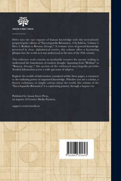 Delve into the vast expanse of human knowledge with this meticulously prepared print edition of "Encyclopaedia Britannica, 11th Edition, Volume 3, Slice 5: Bedlam to Benson, George." A treasure trove of general knowledge presented in clear, alphabetical entries, this volume offers a fascinating glimpse into the world as it was understood at the turn of the 20th century. This reference work remains an invaluable resource for anyone seeking to understand the foundations of modern thought. Spanning from "Bedlam" to "Benson, George," this section of the celebrated encyclopedia provides detailed information across a wide spectrum of subjects. Explore the wealth of information contained within these pages, a testament to the enduring power of organized knowledge. Whether you are a scholar, a history enthusiast, or simply curious about the world, this volume of the "Encyclopaedia Britannica" is a captivating journey through a bygone era. This work has been selected by scholars as being culturally important, and is part of the knowledge base of civilization as we know it. This work is in the public domain in the United States of America, and possibly other nations. Within the United States, you may freely copy and distribute this work, as no entity (individual or corporate) has a copyright on the body of the work. Scholars believe, and we concur, that this work is important enough to be preserved, reproduced, and made generally available to the public. We appreciate your support of the preservation process, and thank you for being an important part of keeping this knowledge alive and relevant.