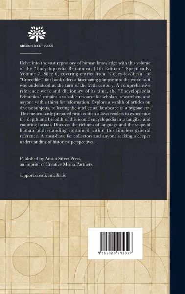 Delve into the vast repository of human knowledge with this volume of the "Encyclopaedia Britannica, 11th Edition." Specifically, Volume 7, Slice 6, covering entries from "Coucy-le-Ch?au" to "Crocodile," this book offers a fascinating glimpse into the world as it was understood at the turn of the 20th century. A comprehensive reference work and dictionary of its time, the "Encyclopaedia Britannica" remains a valuable resource for scholars, researchers, and anyone with a thirst for information. Explore a wealth of articles on diverse subjects, reflecting the intellectual landscape of a bygone era. This meticulously prepared print edition allows readers to experience the depth and breadth of this iconic encyclopedia in a tangible and enduring format. Discover the richness of language and the scope of human understanding contained within this timeless general reference. A must-have for collectors and anyone seeking a deeper understanding of historical perspectives. This work has been selected by scholars as being culturally important, and is part of the knowledge base of civilization as we know it. This work is in the public domain in the United States of America, and possibly other nations. Within the United States, you may freely copy and distribute this work, as no entity (individual or corporate) has a copyright on the body of the work. Scholars believe, and we concur, that this work is important enough to be preserved, reproduced, and made generally available to the public. We appreciate your support of the preservation process, and thank you for being an important part of keeping this knowledge alive and relevant.