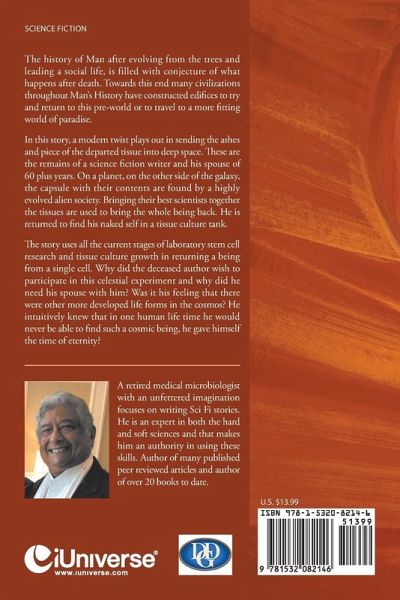 The history of Man after evolving from the trees and leading a social life, is filled with conjecture of what happens after death. Towards this end many civilizations throughout Man's History have constructed edifices to try and return to this pre-world or to travel to a more fitting world of paradise. In this story, a modern twist plays out in sending the ashes and piece of the departed tissue into deep space. These are the remains of a science fiction writer and his spouse of 60 plus years. On a planet, on the other side of the galaxy, the capsule with their contents are found by a highly evolved alien society. Bringing their best scientists together the tissues are used to bring the whole being back. He is returned to find his naked self in a tissue culture tank. The story uses all the current stages of laboratory stem cell research and tissue culture growth in returning a being from a single cell. Why did the deceased author wish to participate in this celestial experiment and why did he need his spouse with him? Was it his feeling that there were other more developed life forms in the cosmos? He intuitively knew that in one human life time he would never be able to find such a cosmic being, he gave himself the time of eternity?