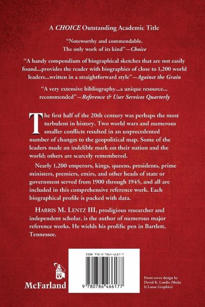The first half of the 20th century was perhaps the most turbulent in history. Two world wars and numerous smaller conflicts resulted in an unprecedented number of changes. Some of the leaders made an indelible mark on their nation and the world; others are scarcely remembered. Nearly 1,200 emperors, kings, queens, presidents, prime ministers, premiers, emirs, and other heads of state or government served from 1900 through 1945, and all are included in this comprehensive reference work. Each biographical profile is packed with data.