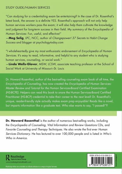 Dr. Howard Rosenthal, author of the best-selling counseling exam book of all time, the Encyclopedia of Counseling, has now created the Encyclopedia of Human Services: Master Review and Tutorial for the Human Services-Board Certified Examination (HS-BCPE). Helpers can read this book to snare the Human Services-Board Certified Practitioner (HS-BCP) credential to take their career to the next level! Dr. Rosenthal's unique, reader-friendly style actually makes exam prep enjoyable! Reads like a novel, but imparts information like a graduate text. Who else wants to say, "I passed!"?