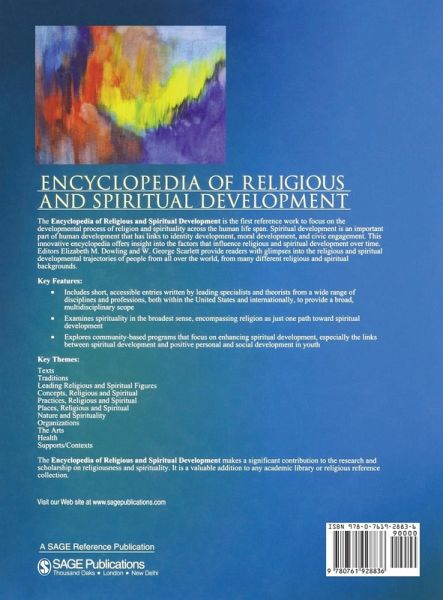 The Encyclopedia of Religious and Spiritual Development is the first reference work to focus on the developmental process of religion and spirituality across the human life span. Spiritual development is an important part of human development that has links to identity development, moral development, and civic engagement. This innovative Encyclopedia offers insight into the characteristics of people and their contexts that interact to influence religious and spiritual development over time. Editors Elizabeth M. Dowling and W. George Scarlett provide readers with glimpses into the religious and spiritual developmental trajectories of people from all over the world, from many different religious and spiritual backgrounds.