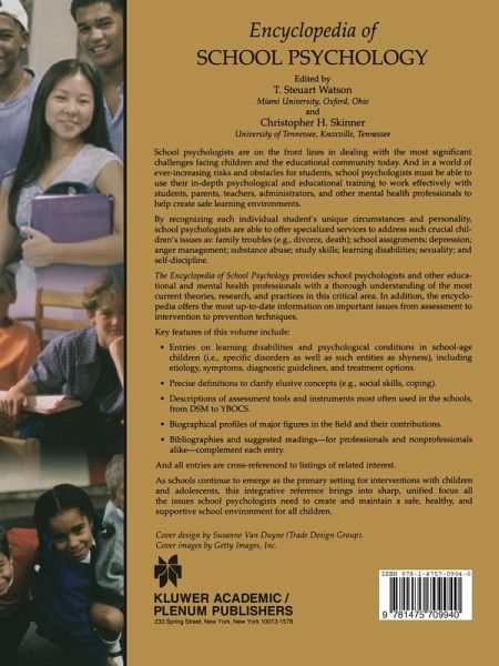 The Encyclopedia of School Psychology provides school psychologists and other educational and mental health professionals with a thorough understanding of the most current theories, research, and practices in this critical area. In addition, the Encyclopedia offers the most up-to-date information on important issues from assessment to intervention to prevention techniques.