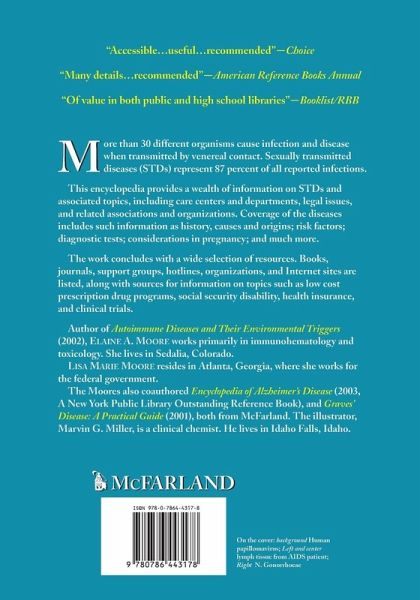 More than 30 different organisms cause infection and disease when transmitted by venereal contact. Sexually transmitted diseases (STDs) represent 87 percent of all reported infections. This encyclopedia provides a wealth of information on STDs and associated topics, including care centers and departments, legal issues, and related associations and organizations. Coverage of the diseases includes such information as history, causes and origins; risk factors; diagnostic tests; considerations in pregnancy; and much more. The work concludes with a wide selection of resources. Books, journals, support groups, hotlines, organizations, and Internet sites are listed, along with sources for information on topics such as low cost prescription drug programs, social security disability, health insurance, and clinical trials.