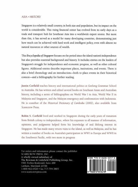 While Singapore is relatively small in size and population, its impact is considerably larger. This rising financial center has evolved from its early days as an entrepot for Southeast Asia into the transport hub and export-source for the world that it is today. More than this, it has served as a model for many developing countries, showing just how much can be achieved by hard work and intelligent policy even when there are almost no natural resources or other evident sources of wealth available. The Encyclopedia of Singapore focuses on the period since the island-nation's independence but also provides essential background on the country's history. It includes brief entries on the leaders of the struggle for independence and economic progress and includes many cultural figures as well. Other entries describe important places, institutions, and events. In addition, there is a brief chronology and an introduction-to place events in their historical context-and a bibliography for any reader who wants to learn more.