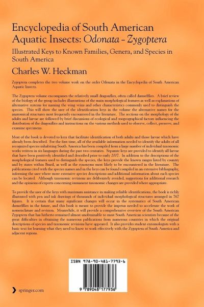 The author, Dr. Charles W. Heckman, has performed ecological research in Laos, Thailand, Germany, Brazil, and the United States. His publications include books on rice field ecology in Thailand and the Pantanal wetland in western Brazil, as well as many monographs and shorter publications on various aspects of biology and environmental sciences. He undertook the preparation of the Encyclopedia of South American Aquatic Insects to produce a reference work with which researchers in South America can identify the species they encounter without having to first complete exhaustive searches of the literature, including papers published on several continents in different languages. The lack of such a tool has long impeded progress in faunal surveys, ecology, and other fields of science. Dr. Heckman's extensive experience identifying aquatic insect species using less than optimal literature has allowed him to develop an ability for recognizing the morphological features most useful for distinguishing one species from another, and this ability comes to the aid of the users of his keys to the South American aquatic insect species.