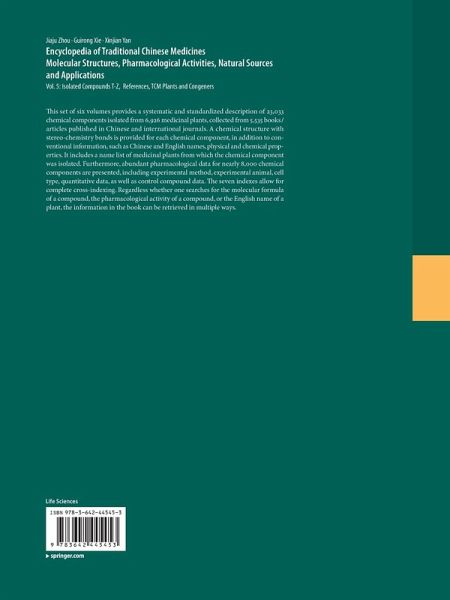 This set of six volumes provides a systematic and standardized description of 23,033 chemical components isolated from 6,926 medicinal plants, collected from 5,535 books/articles published in Chinese and international journals. A chemical structure with stereo-chemistry bonds is provided for each chemical component, in addition to conventional information, such as Chinese and English names, physical and chemical properties. It includes a name list of medicinal plants from which the chemical component was isolated. Furthermore, abundant pharmacological data for nearly 8,000 chemical components…mehr