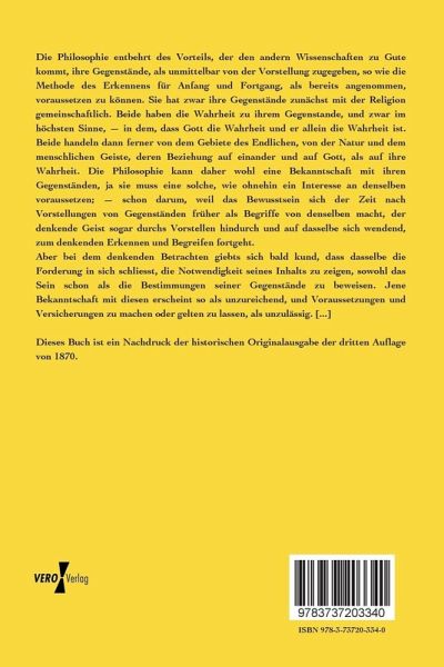 Die Philosophie entbehrt des Vorteils, der den andern Wissenschaften zu Gute kommt, ihre Gegenstände, als unmittelbar von der Vorstellung zugegeben, so wie die Methode des Erkennens für Anfang und Fortgang, als bereits angenommen, voraussetzen zu können. Sie hat zwar ihre Gegenstände zunächst mit der Religion gemeinschaftlich. Beide haben die Wahrheit zu ihrem Gegenstande, und zwar im höchsten Sinne, in dem, dass Gott die Wahrheit und er allein die Wahrheit ist. Beide handeln dann ferner von dem Gebiete des Endlichen, von der Natur und dem menschlichen Geiste, deren Beziehung auf einander und auf Gott, als auf ihre Wahrheit. Die Philosophie kann daher wohl eine Bekanntschaft mit ihren Gegenständen, ja sie muss eine solche, wie ohnehin ein Interesse an denselben voraussetzen; schon darum, weil das Bewusstsein sich der Zeit nach Vorstellungen von Gegenständen früher als Begriffe von denselben macht, der denkende Geist sogar durchs Vorstellen hindurch und auf dasselbe sich wendend, zum denkenden Erkennen und Begreifen fortgeht.