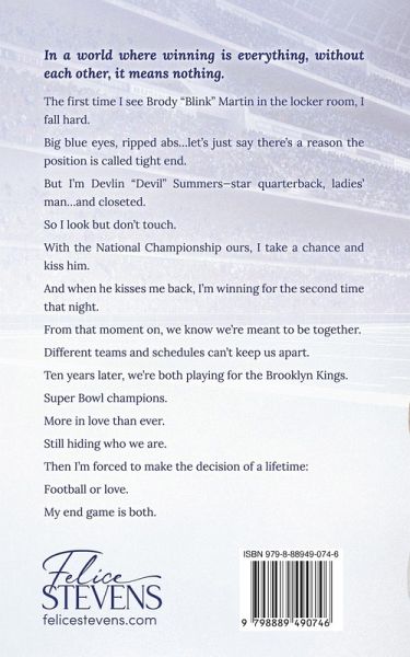 The first time I see Brody "Blink" Martin in the locker room, I fall hard. Big blue eyes, ripped abs...let's just say there's a reason the position is called tight end. But I'm Devlin "Devil" Summers-star quarterback, ladies' man...and closeted. So I look but don't touch. With the National Championship ours, I take a chance and kiss him. And when he kisses me back, I'm winning for the second time that night. From that moment on, we know we're meant to be together. Different teams and schedules can't keep us apart. Ten years later, we're both playing for the Brooklyn Kings. Super Bowl champions. More in love than ever. Still hiding who we are. Then I'm forced to make the decision of a lifetime: Football or love. My end game is both.