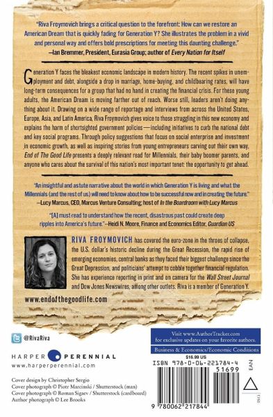 Generation Y faces the bleakest economic landscape in modern history. The recent spikes in unemployment and debt, alongside a drop in marriage, home-buying, and childbearing rates, will have long-term consequences for a group that had no hand in creating the financial crisis. For these young adults, the American Dream is moving farther out of reach. Worse still, leaders aren't doing anything about it. Drawing on a wide range of reportage and interviews from across the United States, Europe, Asia, and Latin America, Riva Froymovich gives voice to those struggling in this new economy and explains the harm of shortsighted government policies?including initiatives to curb the national debt and key social programs. Through policy suggestions that focus on social enterprise and investment in economic growth, as well as inspiring stories from young entrepreneurs carving out their own way, End of The Good Life presents a deeply relevant read for Millennials, their baby boomer parents, and anyone who cares about the survival of this nation's most important tenet: the opportunity to get ahead.