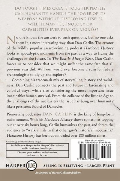 Now a New York Times Bestseller. The creator of the wildly popular award-winning podcast Hardcore History looks at some of the apocalyptic moments from the past as a way to frame the challenges of the future. Do tough times create tougher people? Can humanity handle the power of its weapons without destroying itself? Will human technology or capabilities ever peak or regress? No one knows the answers to such questions, but no one asks them in a more interesting way than Dan Carlin. In The End is Always Near, Dan Carlin looks at questions and historical events that force us to consider what sounds like fantasy; that we might suffer the same fate that all previous eras did. Will our world ever become a ruin for future archaeologists to dig up and explore? The questions themselves are both philosophical and like something out of The Twilight Zone. Combining his trademark mix of storytelling, history and weirdness Dan Carlin connects the past and future in fascinating and colorful ways. At the same time the questions he asks us to consider involve the most important issue imaginable: human survival. From the collapse of the Bronze Age to the challenges of the nuclear era the issue has hung over humanity like a persistent Sword of Damocles. Inspired by his podcast, The End is Always Near challenges the way we look at the past and ourselves. In this absorbing compendium, Carlin embarks on a whole new set of stories and major cliffhangers that will keep readers enthralled. Idiosyncratic and erudite, offbeat yet profound, The End is Always Near examines issues that are rarely presented, and makes the past immediately relevant to our very turbulent present.
