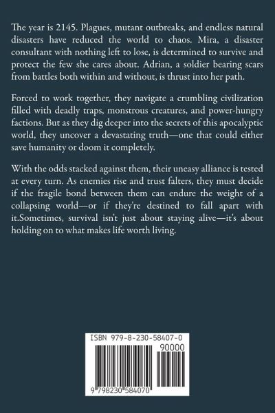 The year is 2145. Plagues, mutant outbreaks, and endless natural disasters have reduced the world to chaos. Mira, a disaster consultant with nothing left to lose, is determined to survive and protect the few she cares about. Adrian, a soldier bearing scars from battles both within and without, is thrust into her path.Forced to work together, they navigate a crumbling civilization filled with deadly traps, monstrous creatures, and power-hungry factions. But as they dig deeper into the secrets of this apocalyptic world, they uncover a devastating truth-one that could either save humanity or doom it completely.With the odds stacked against them, their uneasy alliance is tested at every turn. As enemies rise and trust falters, they must decide if the fragile bond between them can endure the weight of a collapsing world-or if they're destined to fall apart with it.Sometimes, survival isn't just about staying alive-it's about holding on to what makes life worth living.
