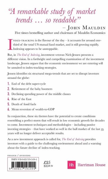 Index-tracking is the flavour of the day - it accounts for around one-third of the total US mutual fund market, and is still growing rapidly. Indexing appears to be unstoppable. But, in The End of Indexing, investment veteran Niels Jensen presents a different vision. In a forthright and compelling examination of the investment landscape, Jensen argues that the economic environment we are entering will be unsuited to index-tracking strategies. Jensen identifies six structural mega-trends that are set to disrupt investors around the globe: 1. End of the debt super-cycle 2. Retirement of the baby boomers 3. Declining spending power of the middle classes 4. Rise of the East 5. Death of fossil fuels 6. Mean reversion of wealth-to-GDP In conjunction, these six themes have the potential to create conditions resembling a perfect storm that will result in low economic growth for decades to come. Investment techniques and methodologies - including passive investing strategies - that have worked so well in the bull market of the last 35 years will no longer deliver acceptable results. As a new investment approach is called for, The End of Indexing provides investors with a guide to the challenging environment ahead and a warning about the future decline of index-tracking.