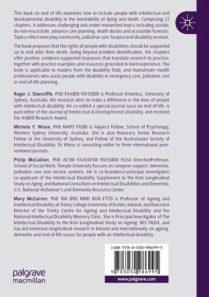 Chapter 1: Current and New Developments in Death, Dying and End-Of-Life Care Policies and Practices.- Chapter 2: Experience of End-of-Life Issues by People with Intellectual Disability.- Chapter 3: Suicide and Autism: A Lifespan Perspective.- Chapter 4: Advance Care Planning with and for People who have Intellectual and Developmental Disabilities.- Chapter 5: Decision-Making at the End of Life: Challenges and Opportunities for People with Intellectual and Multiple Disabilities in Residential Homes in Germany.- Chapter 6: How People with Intellectual Disability are Dying and Implications for Quality Care.- Chapter 7: Living and Dying Well with Dementia.- Chapter 8: Building shared end-of-life supports and cross-training for hospice/palliative and intellectual disability services providers.- Chapter 9: Supporting People with Intellectual Disability at End of Life: Moral Distress among Staff Caregivers During COVID-19.- Chapter 10: Accessible Funerals and People with Intellectual Disability.- Chapter 11: End-of-Life Doulas and People Living with Intellectual and Developmental Disability.- Chapter 12: Palliative and End-of-Life Care for Children with Intellectual Disabilities.- Chapter 13: End-of-life Issues and Support Needs of People with Profound Intellectual and Multiple Disability.- Chapter 14: The Process of Dying.- Chapter 15: Use of Do-Not-Resuscitate Orders.- Chapter 16: Positioning the Issues: An Agenda for Future End-of-life Research, Policy and Practice.- Chapter 17 End-of Life Resources.