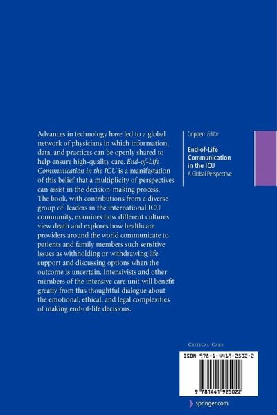 Talking to patients and their families about end-of-life issues can be difficult and stressful. End of Life Communication in the ICU looks at ways different cultures view death and then further explores how health care providers around the world communicate about such sensitive issues as withholding or withdrawing life support and discussing options when the outcome is uncertain. Through a better understanding of cultural differences in attitudes about death and methods of communications about end-of-life issues, practitioners can be better prepared to communicate with their own patients and their patients' families.
