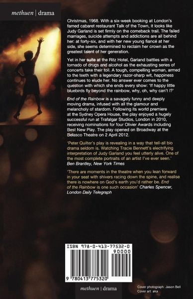 Musical drama of Judy Garland's "come-back" concerts Christmas 1968: with a six week booking at London's Talk of the Town, it looks like Judy Garland is set firmly on the comeback trail. The failed marriages, the suicide attempts and the addictions are all behind her. At forty-six and with new flame Mickey Deans at her side, she seems determined to carry it off and recapture her magic. But lasting happiness always eludes some people, and there was never any answer to the question with which Judy ended every show: "If happy little bluebirds fly beyond the rainbow, why, oh, why, can't I?" End of the Rainbow is a savagely funny drama featuring a glorious ensemble of Judy Garland hits and infused with the glamour and the melancholy of stardom. "Every note she sings, every racket she makes, every tear she sheds, every joke she cracks, every pill she pops - is conveyed with alarming honesty. This knockout portrait of a living catastrophe should not be missed." What's On Published to tie-in with the premiere at the Sydney Opera House in July 2005