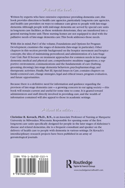 People with mid-stage dementia are served by special care units in long-term care facilities, although as these residents deteriorate, they are transferred out of the unit and into a general nursing home unit. These nursing homes are not equipped to deal with palliative needs of end-stage dementia care. The book addresses those needs. With this in mind, Part One examines the stages of dementia end-stage in particular. Other chapters in this section provide background on the hospice movement and hospice concepts; the idea of maintaining personhood; and administration of a late-stage care unit. Part Two focuses on treatment approaches for common needs in end-stage dementia - medical and physical care; a supportive environment; the fundamentals of care; psychopharmacology; and therapeutic activities. Part 3 contains chapters on family-centred care; legal and ethical issues; programme evaluation; and future opportunities.