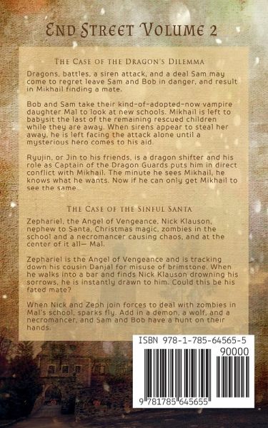 THE CASE OF THE DRAGON'S DILEMMA Dragons, battles, a deal Sam may come to regret, and a Siren attack, leave Sam and Bob in danger, and Mikhail finding a mate. Bob and Sam take their kind-of-adopted-now vampire daughter, Mal to look round new schools. Mikhail is left to babysit the last remaining rescued child whilst they are away. When Sirens appear to steal her away he is left facing the attack alone until a mysterious hero comes to his aid. Ryujin, or Jin to his friends, is a dragon shifter and his role as Captain of the Dragon Guard puts him in direct conflict with Mikhail. The minute he sees Mikhail he knows what he wants. Now if he can only get Mikhail to see the same. THE CASE OF THE SINFUL SANTA Zephariel, the Angel of Vengeance, Nick Klauson, nephew to Santa, Christmas magic, zombies in the school and a necromancer causing chaos...and at the center of it all-Mal. Zephariel is the Angel of Vengeance and is tracking down his cousin Danjal for misuse of brimstone. When he walks into a bar and finds Nick Klauson drowning his sorrows, he is instantly drawn to him. Could this be his fated mate? When Nick and Zeph join forces to deal with zombies in Mal's school, sparks fly. Add in a demon, a wolf and a necromancer, and Sam and Bob have a hunt on their hands.