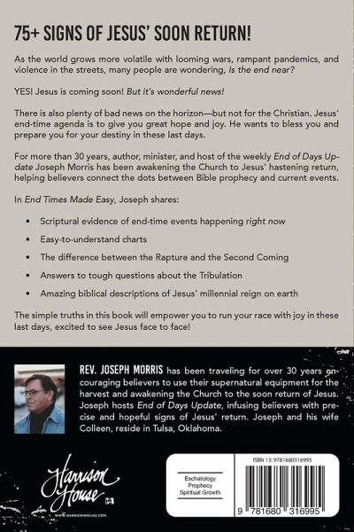 75+ Signs of Jesus' Soon Return! As the world grows more volatile with looming wars, rampant pandemics, and violence in the streets, many people are wondering, Is the end near? YES! Jesus is coming soon! But it's wonderful news! There is also plenty of bad news on the horizon-but not for the Christian. Jesus' end-time agenda is to give you great hope and joy. He wants to bless you and prepare you for your destiny in these last days. For more than 30 years, author, minister, and host of the weekly End of Days Update Joseph Morris has been awakening the Church to Jesus' hastening return, helping believers connect the dots between Bible prophecy and current events. In End Times Made Easy, Joseph shares: Scriptural evidence of end-time events happening right now Easy-to-understand charts The difference between the Rapture and the Second Coming Answers to tough questions about the Tribulation Amazing biblical descriptions of Jesus' millennial reign on earth The simple truths in this book will empower you to run your race with joy in these last days, excited to see Jesus face to face!