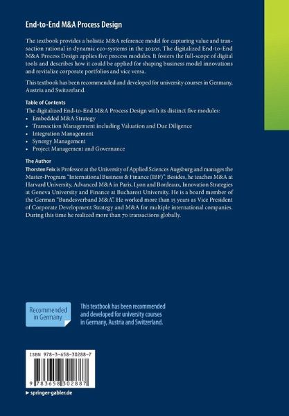 The textbook provides a holistic M&A reference model for capturing value and transaction rational in dynamic eco-systems in the 2020s. The digitalized End-to-End M&A Process Design applies five process modules. It fosters the full-scope of digital tools and describes how it could be applied for shaping business model innovations and revitalize corporate portfolios and vice versa.This textbook has been recommended and developed for university courses in Germany, Austria and Switzerland.
