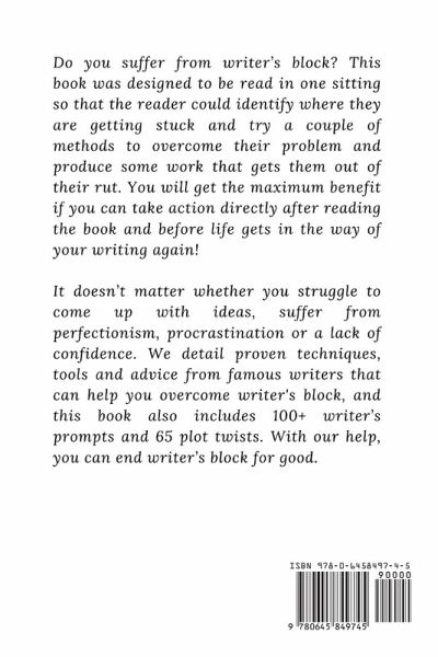 Do you suffer from writer's block? This book was designed to be read in one sitting so that the reader could identify where they are getting stuck and try a couple of methods to overcome their problem and produce some work that gets them out of their rut. You will get the maximum benefit if you can take action directly after reading the book and before life gets in the way of your writing again! It doesn't matter whether you struggle to come up with ideas, suffer from perfectionism, procrastination or a lack of confidence. We detail proven techniques, tools and advice from famous writers that can help you overcome writer's block, and this book also includes 100+writer's prompts and 65 plot twists. With our help, you can end writer's block for good.