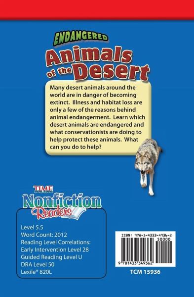 Many desert animals around the world are in danger of becoming extinct. In this enlightening nonfiction title readers will learn a few of the causes of extinction and what problems extinction causes for animals wildlife and humans alike.