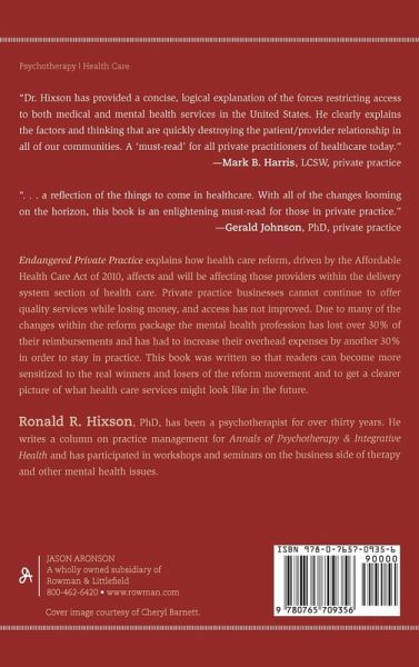 Endangered Private Practice explains how private practices are being absorbed by the current health care reform movement as a way to control costs, limit access, decrease disparities, and increase quality of care. This is the story of a fading art being squashed by the interests of business and politics. Also shared are many of the providers’ concerns and fears for the future of medical and mental health care services.