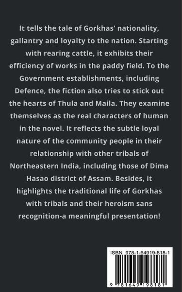 It tells the tale of Gorkhas' nationality, gallantry and loyalty to the nation. Starting with rearing cattle, it exhibits their efficiency of works in the paddy field. To the Government establishments, including Defence, the fiction also tries to stick out the hearts of Thula and Maila. They examine themselves as the real characters of human in the novel. It reflects the subtle loyal nature of the community people in their relationship with other tribals of Northeastern India, including those of Dima Hasao district of Assam. Besides, it highlights the traditional life of Gorkhas with tribals and their heroism sans recognition-a meaningful presentation!