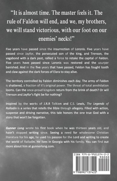Five years have passed since the insurrection of Loronis. Five years have passed since Jayfor, the persecuted son of the king, and Trenson, the vagabond with a dark past, rallied a force to retake the capital of Faldon. Five years have passed since Loronis was restored and the usurper banished. And in the five years that have passed, Faldon has fought tooth and claw against the dark forces of Elara to stay alive. The territory controlled by Faldon diminishes each day. The army of Faldon is shattered, a fraction of it's original power. The threat of total annihilation looms. Can the once-proud kingdom return from the brink of death? Or will Trenson and Jayfor's fight be for nothing? Inspired by the works of J.R.R Tolkien and C.S. Lewis, The Legends of Ralladin is a series that retells the Bible through allegory. Filled with action, suspense and driving narrative, this tale honors the one true God with a story that won't be forgotten.