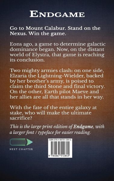 Go to Mount Calabur. Stand on the Nexus. Win the game. Eons ago, a game to determine galactic dominance began. Now, on the distant world of Elystra, that game is reaching its conclusion. Two mighty armies clash: on one side, Elzaria the Lightning-Wielder, backed by her brother's army, is poised to claim the third Stone and final victory. On the other, Earth pilot Maeve and her allies are all that stands in her way. With the fate of the entire galaxy at stake, who will make the ultimate sacrifice? This is the large print edition of Endgame, with a larger font / typeface for easier reading.