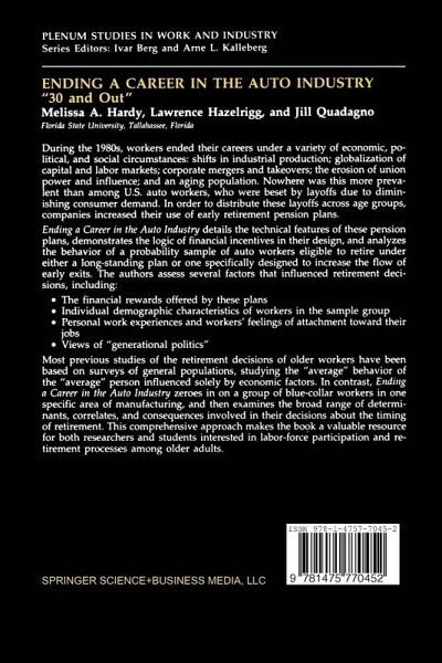 During the 1980s the news media were filled with reports of soaring unemployment as 'downsizing' and `restructuring' became the new buzzwords. Firms managed their workforce reduction by increasing the attractiveness of their pension plans-especially their early-retirement plans. In this volume, the authors examine the U.S. auto industry and present a full-scale analysis of the work and retirement decisions of its workers. They address organizational context and the logic of financial incentives in employer-provided early retirement plans. The impact of pension provisions, layoffs, plant closures, attitudes about `generational equity', and other factors influencing the workers' evaluation of the optimum time to end their careers in the auto industry are explored.