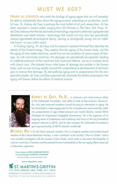 With a New Afterword Must We Age? Nearly all scientists who study the biology of aging agree that we will someday be able to substantially slow down the aging process, extending our productive, youthful lives. Dr. Aubrey de Grey is perhaps the most bullish of all such researchers. As has been reported in media outlets ranging from 60 Minutes to The New York Times, Dr. de Grey believes that the key biomedical technology required to eliminate aging-derived debilitation and death entirely-technology that would not only slow but periodically reverse age-related physiological decay, leaving us biologically young into an indefinite future-is now within reach. In Ending Aging, Dr. de Grey and his research assistant Michael Rae describe the details of this biotechnology. They explain that the aging of the human body, just like the aging of man-made machines, results from an accumulation of various types of damage. As with man-made machines, this damage can periodically be repaired, leading to indefinite extension of the machine's fully functional lifetime, just as is routinely done with classic cars. We already know what types of damage accumulate in the human body, and we are moving rapidly toward the comprehensive development of technologies to remove that -damage. By demystifying aging and its postponement for the nonspecialist reader, de Grey and Rae systematically dismantle the fatalist presumption that aging will forever defeat the efforts of medical science.
