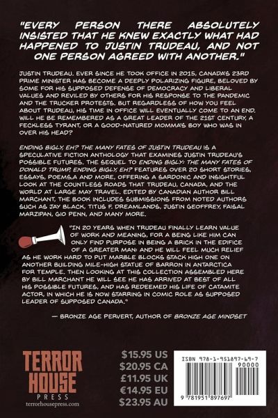 "Every person there absolutely insisted that he knew exactly what had happened to Justin Trudeau, and not one person agreed with another." Justin Trudeau. Ever since he took office in 2015, Canada's 23rd prime minister has become a deeply polarizing figure, beloved by some for his supposed defense of democracy and liberal values and reviled by others for his response to the pandemic and the trucker protests. But regardless of how you feel about Trudeau, his time in office will eventually come to an end. Will he be remembered as a great leader of the 21st century, a feckless tyrant, or a good-natured momma's boy who was in over his head? Ending Bigly, Eh? The Many Fates of Justin Trudeau is a speculative fiction anthology that examines Justin Trudeau's possible futures. The sequel to Ending Bigly: The Many Fates of Donald Trump, Ending Bigly, Eh? features over 20 short stories, essays, poems, and more, offering a sardonic and insightful look at the countless roads that Trudeau, Canada, and the world at large may travel. Edited by Canadian author Bill Marchant, the book includes submissions from noted authors such as Jay Black, Titus F. Dreamlands, Justin Geoffrey, Faisal Marzipan, Gio Penn, and many more.