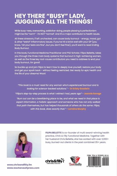 Hey there "busy" lady, juggling all the things! While busy-ness, overworking, addictive-doing, people pleasing & perfectionism might be the "norm" - it's NOT "normal". And it's a major contributor to health issues. All these stressors, if left unchecked, can cause body burnout - energy, mood, gut & other "weird" inflammatory issues. If you've hit a brick wall with your GP (you know..."all your tests are fine"...but you don't feel fine!), you'll want to read Ending Body Burnout. In this book, Functional Medicine Practitioner and PhD Scholar, Filipa Bellette, takes you through the three main…mehr