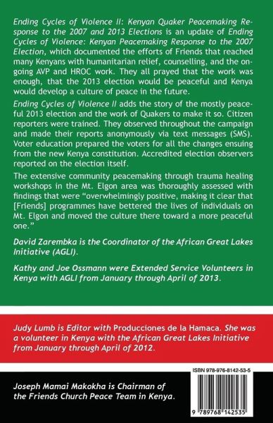 Ending Cycles of Violence II adds the story of the mostly peaceful 2013 election and the work of Quakers to make it so. Citizen reporters were trained and observed throughout the campaign and made their reports anonymously via text messages (SMS). Voter education prepared the voters for all the changes ensuing from the new Kenya constitution. Accredited election observers reported on the election itself. The extensive community peacemaking through trauma healing workshops especially concentrated in the Mt. Elgon area was thoroughly assessed with findings that were "overwhelmingly positive, making it clear that AGLI/FCPT/CAPI/TTT programmes have bettered the lives of individuals on Mt. Elgon.