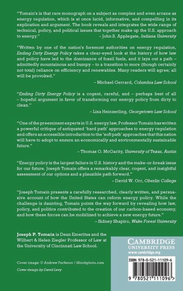 Climate change presents the United States, and the world, with regulatory problems of a magnitude, complexity and scope unseen before. The United States, however, particularly after the mid-term elections of 2010, lacks the political will necessary to aggressively address climate change. Most current books focus on climate change. Ending Dirty Energy Policy argues that the US will not adequately address climate change until it transforms its fossil fuel energy policy. Yet there are signs that the country will support the transformation of its century-old energy policy from one that is dependent on fossil fuels to a low-carbon energy portfolio. A transformative energy policy that favors energy efficiency and renewable resources can occur only after the US has abandoned the traditional fossil fuel energy policy, has redesigned regulatory systems to open new markets and promoted competition among new energy providers, and has stimulated private-sector commercial and venture capital investment in energy innovations that can be brought to commercial scale and marketability.