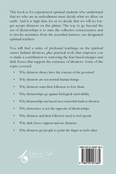 This book is for experienced spiritual students who understand that we who are in embodiment must decide what we allow on earth. And it is high time for us to decide that we will no longer accept dictators on this planet. The way to go beyond the era of dictatorships is to raise the collective consciousness and to invoke assistance from the ascended masters, our designated spiritual teachers. You will find a series of profound teachings on the spiritual causes behind dictators, plus practical tools that empower you to make a contribution to removing the fear-based energies and dark forces that support the existence of dictators. Some of the topics covered: Why dictators always have the consent of the governed Why dictators are not normal human beings Why dictators want their followers to love them Why dictatorships go against biological survivability Why dictatorships are based on a vision that leads to division Why democracy is not the opposite of dictatorships Why dictators and their followers need to feel special Why dark forces support and use dictators Why dictators get people to point the finger at each other