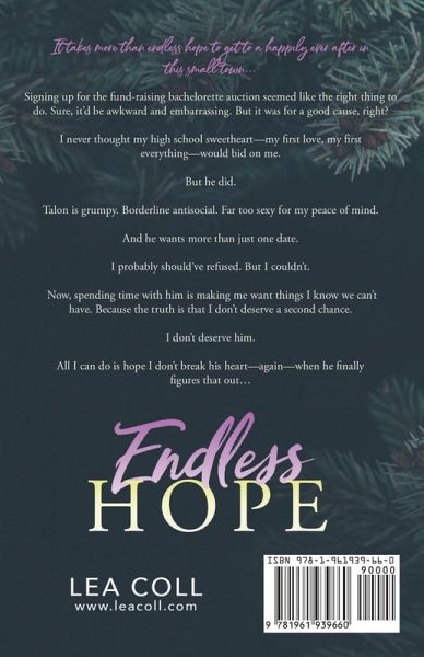It takes more than endless hope to get to a happily ever after in this small town... Signing up for the fund-raising bachelorette auction seemed like the right thing to do. Sure, it'd be awkward and embarrassing. But it was for a good cause, right? I never thought my high school sweetheart-my first love, my first everything-would bid on me. But he did. Talon is grumpy. Borderline antisocial. Far too sexy for my peace of mind. And he wants more than just one date. I probably should've refused. But I couldn't. Now, spending time with him is making me want things I know we can't have. Because the truth is that I don't deserve a second chance. I don't deserve him. All I can do is hope I don't break his heart-again-when he finally figures that out...