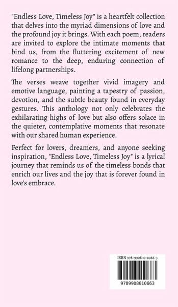 "Endless Love, Timeless Joy" is a heartfelt collection that delves into the myriad dimensions of love and the profound joy it brings. With each poem, readers are invited to explore the intimate moments that bind us, from the fluttering excitement of new romance to the deep, enduring connection of lifelong partnerships. The verses weave together vivid imagery and emotive language, painting a tapestry of passion, devotion, and the subtle beauty found in everyday gestures. This anthology not only celebrates the exhilarating highs of love but also offers solace in the quieter, contemplative moments that resonate with our shared human experience. Perfect for lovers, dreamers, and anyone seeking inspiration, "Endless Love, Timeless Joy" is a lyrical journey that reminds us of the timeless bonds that enrich our lives and the joy that is forever found in love's embrace.