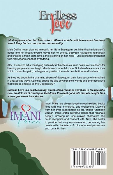 What happens when two hearts from different worlds collide in a small Southern town? They find an unexpected commonality. Maia Collins never planned to rebuild her life in Sweetgum, but inheriting her late aunt's house and her recent divorce leaves her no choice. Between navigating heartbreak and chasing a fresh start, love is the last thing on her mind-until a chance encounter with Alex Zhang changes everything. Alex, a reserved artist managing his family's Chinese restaurant, has his own reasons for keeping people at arm's length after his own recent divorce. But when Maia's vivacious spirit crosses his path, he begins to question the walls he's built around his heart. As they jog through the charming streets of Sweetgum, their lives become intertwined in unexpected ways. Can they bridge the gap between their worlds and embrace a love that feels as endless as the Georgia sky? Fans of sweet, small-town romances will fall for Endless Love! Grab your copy now and discover how love finds its way when you least expect it. This is a sweet romance standalone taking place in the small town of Sweetgum Meadows.